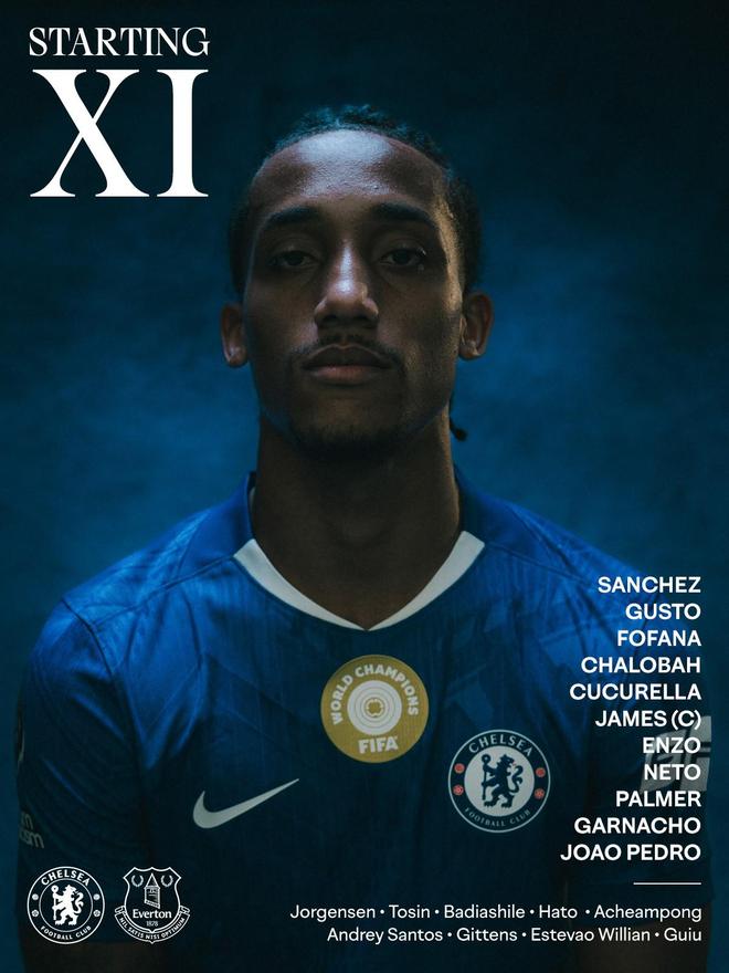 切尔西首发:1-桑切斯、27-古斯托、29-福法纳、23-查洛巴、3-库库雷利亚、24-里斯-詹姆斯、8-恩佐-费尔南德斯、7-内托、10-帕尔默、49-加纳乔、20-若昂-佩德罗